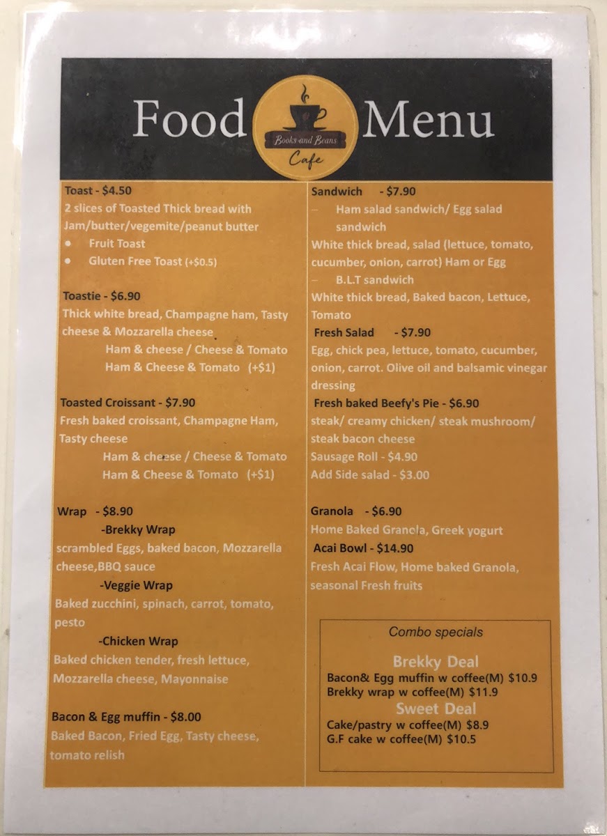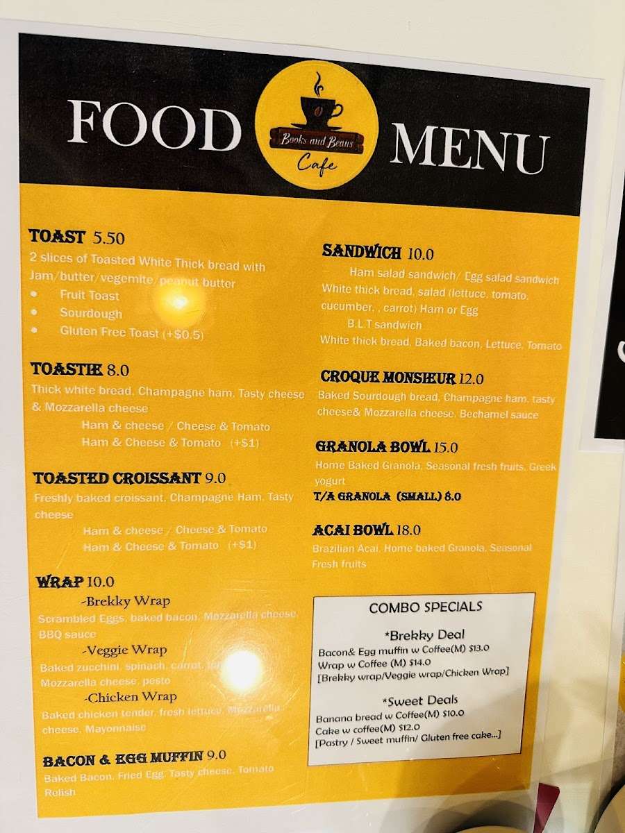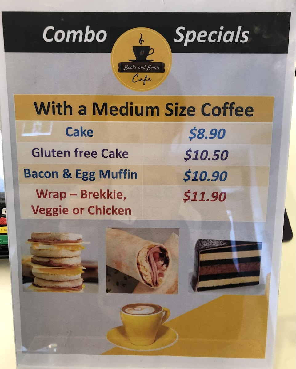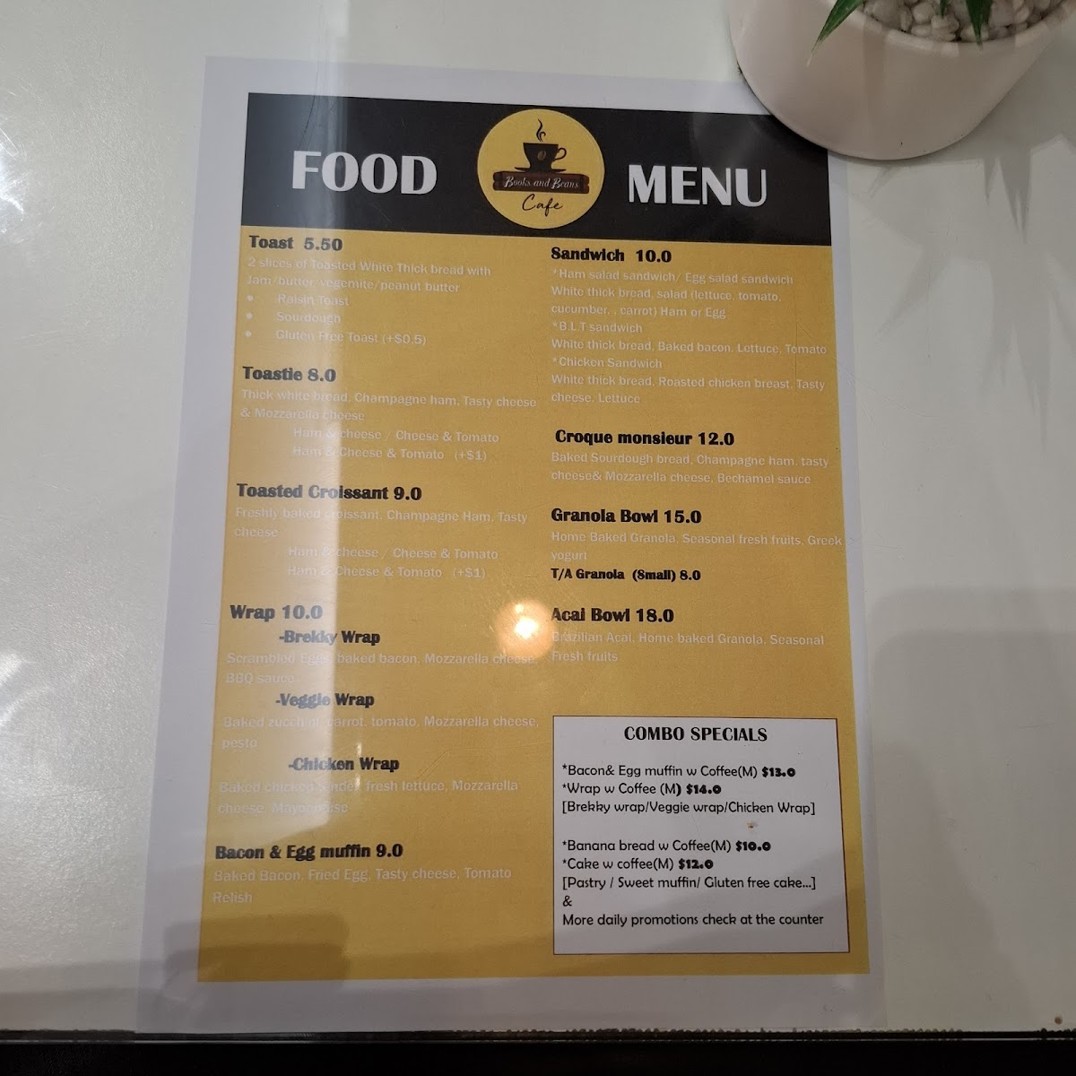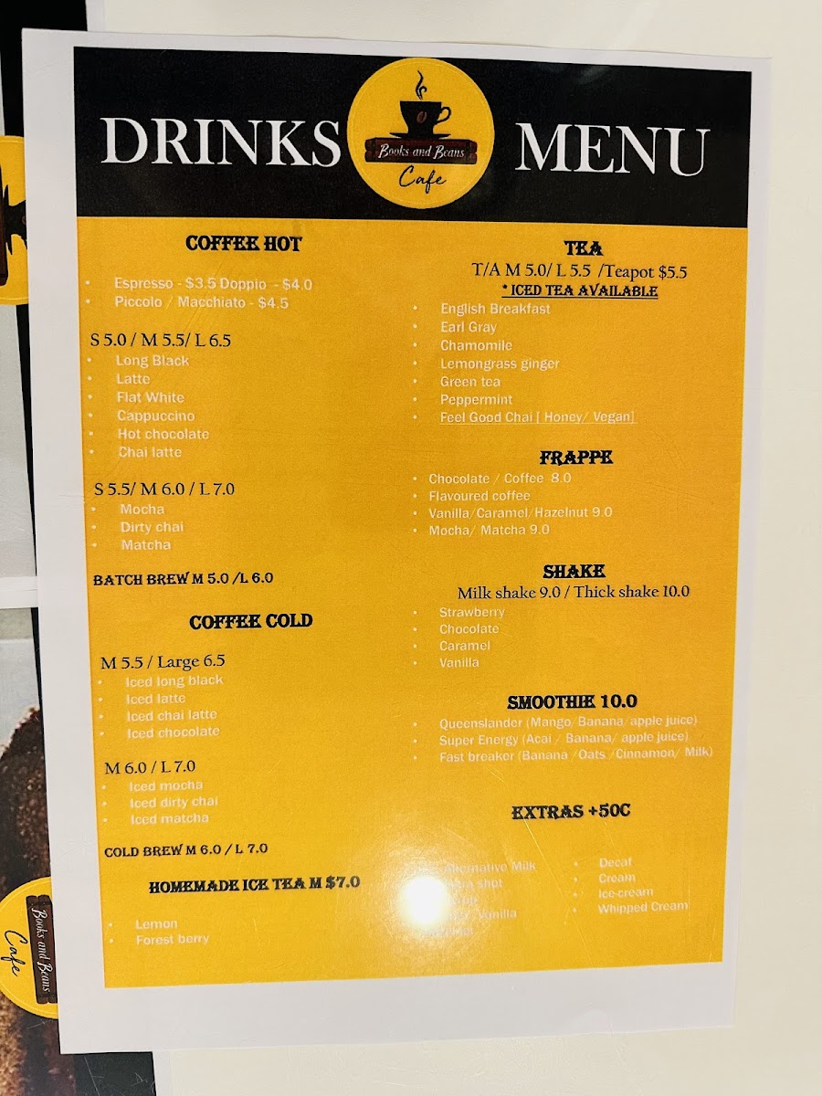 From a reviewer’s perspective, the menu at Books & Beans Cafe on 116 Adelaide St offers a well-rounded mix of budget-friendly options and comforting café classics. For those seeking a quick, satisfying bite under $10, the café delivers with items like the Bacon & Egg Muffin, Bacon & Egg Wrap, Cheese & Tomato Toastie, Ham & Cheese Toastie, and Ham & Cheese Croissant, all simple yet reliably tasty. Coffee lovers are well catered for, with staples such as Espresso, Piccolo, Macchiato, Cappuccino, and Flat White, ensuring a solid start to the day or a smooth mid-afternoon pick-me-up. For something sweeter, the menu’s snacks-Sourdough With Spreads, Raisin Toast, Banana Bread, Brownie, and Caramel Slice-offer comforting, homemade-style indulgences. Health-conscious diners will appreciate the selection of smoothies like Fast Breaker, Queenslander, and Super Energy, alongside freshly squeezed juices including Fresh Orange Juice, Fruits, and ImmuneRoots, which feel both refreshing and nourishing. While the offerings lean toward familiar café fare, the balance of affordable breakfast options, indulgent treats, and wholesome drinks makes Books & Beans Cafe a dependable spot for a casual bite, whether you’re in need of a quick snack, a revitalizing beverage, or a light meal to accompany your day in Brisbane City.